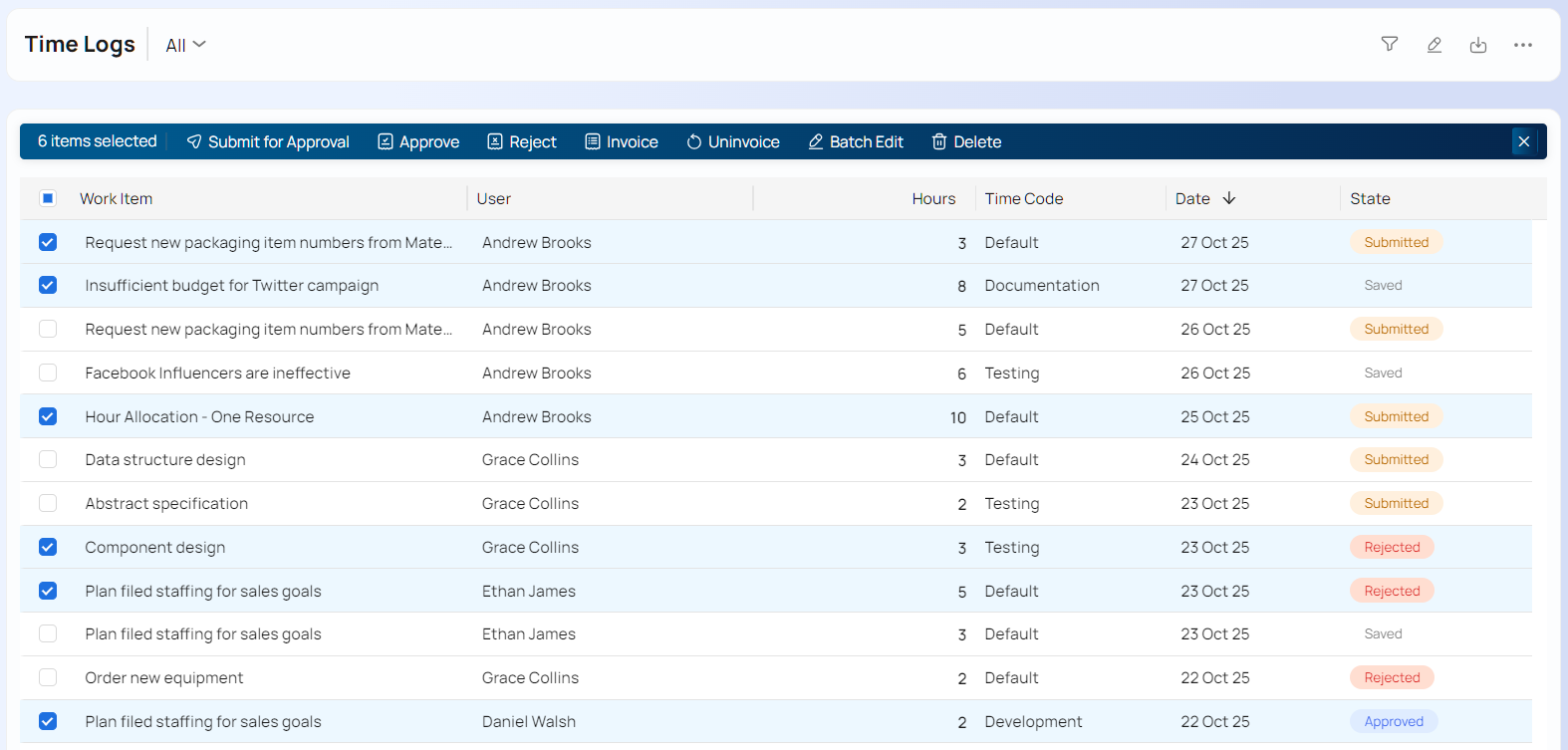 You can select multiple time entries and perform actions on them. In any time log report, Click on the next to the checkbox in the report table header as shown below: