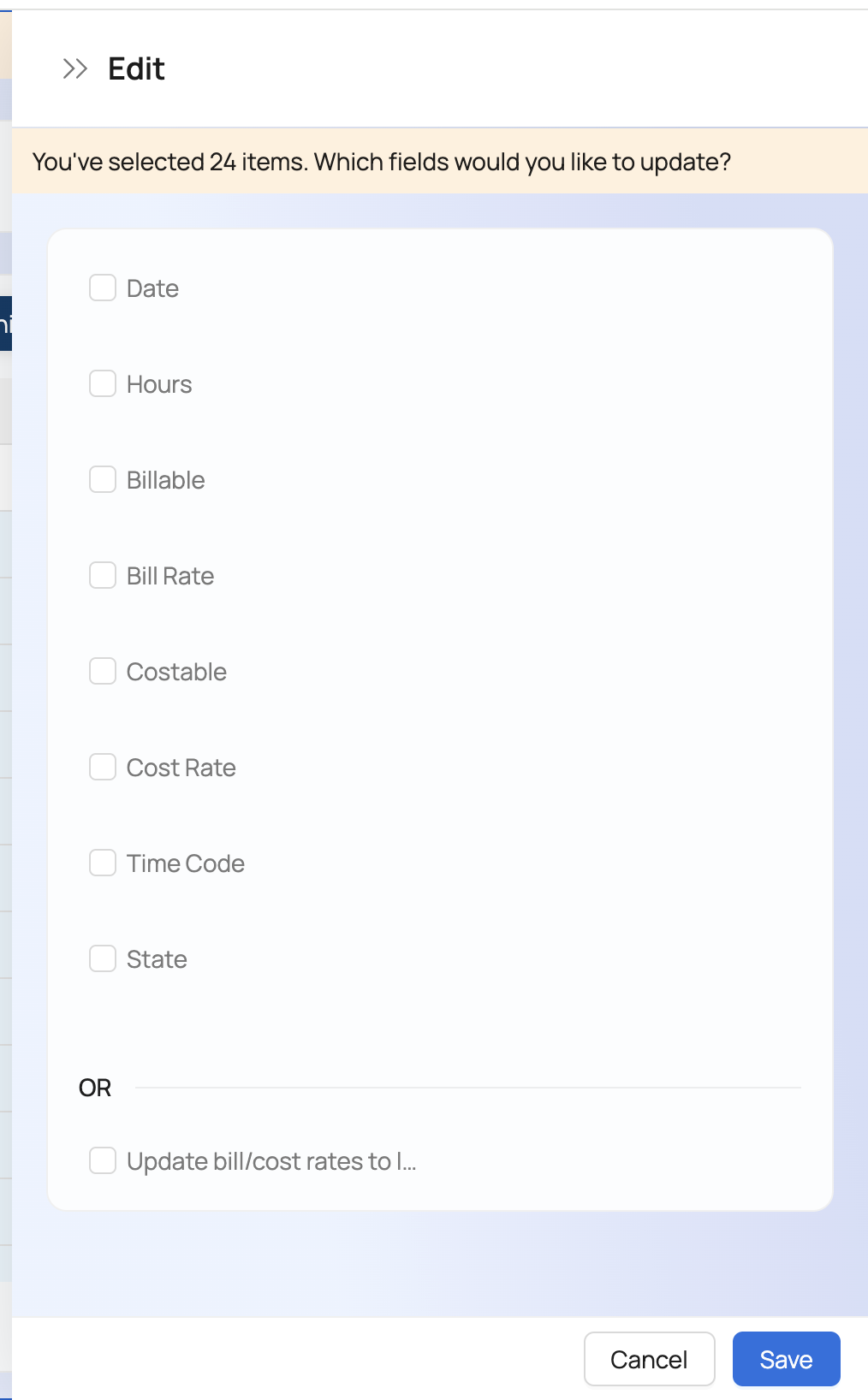 You can set individual attributes of time entries or update the bill and cost rates to the latest values. The latter is especially useful when you have modified the rates and you need to update time entries with the new ones.