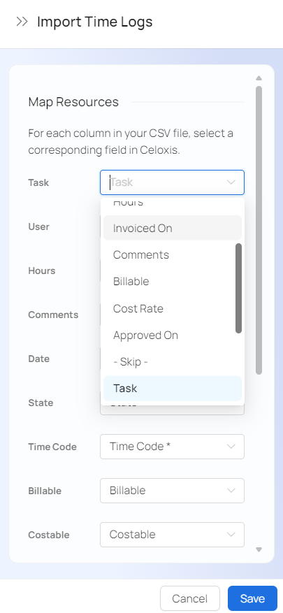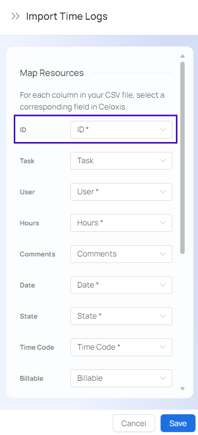 Celoxis also provides the ability to update the existing time entries by importing a CSV file. To update time entries you must include the of the time entries in the CSV file.