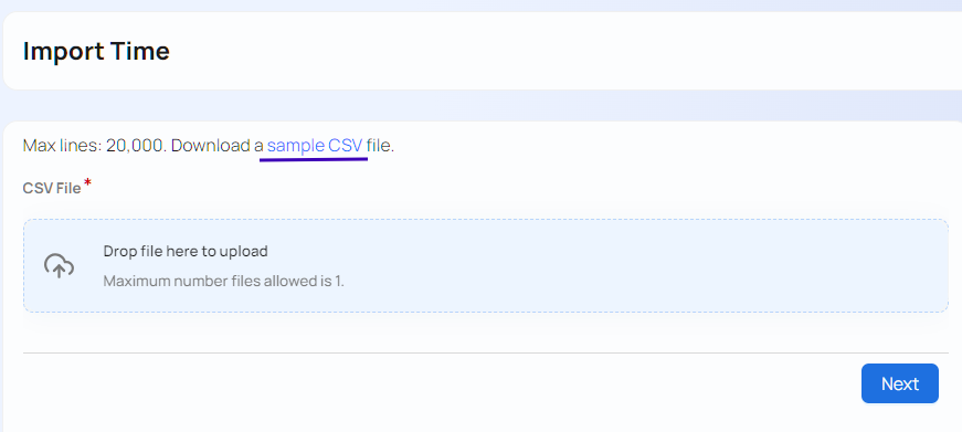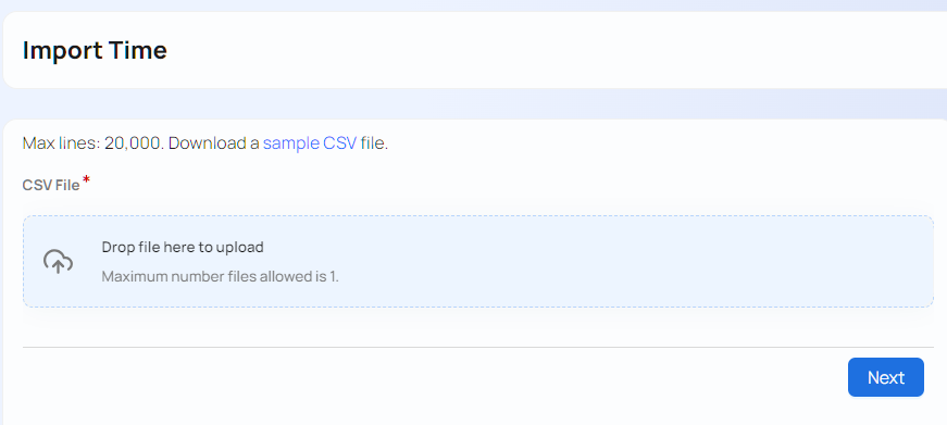 To import time entries, navigate to Top Menu ▸ ▸ Admin ▸ Timesheet ▸ Import Time (CSV).