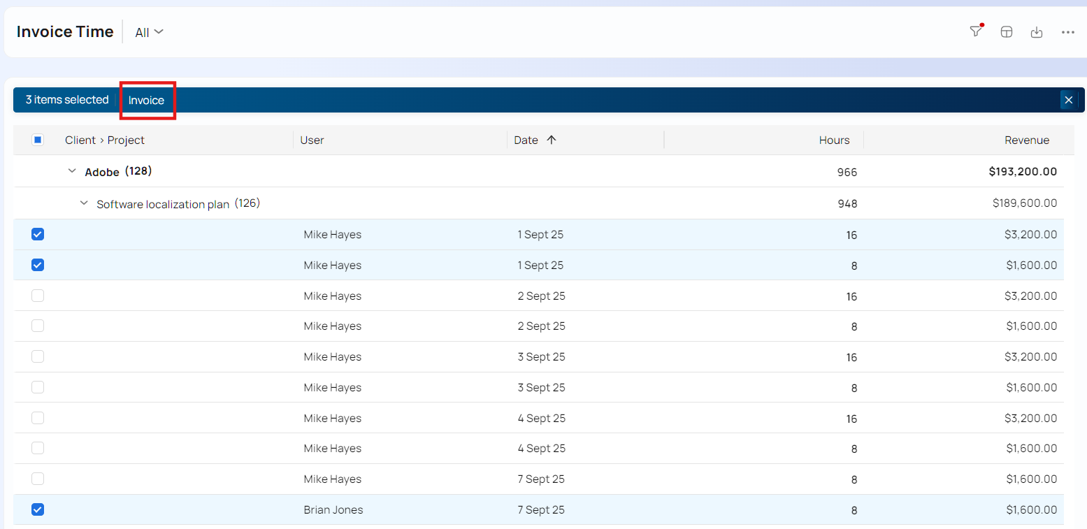 By marking time entries as invoiced, you are indicating that the client has been sent an official invoice from your company. You will need the Time & Expense > Invoice : Granted privilege to mark time as invoiced. To mark time as invoiced, click ▸ ▸ . This will show a list of all billable time entries that have been approved but not invoiced.