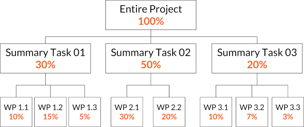 Bottom-up estimation, as the name suggests, starts with estimations for the more detailed tasks and walks upwards in the Work Breakdown Structure to produce the final estimates of each summary task. We already did a big part of the bottom-up estimating process when writing down the Work Breakdown Structure of our project. Remember we also discussed the estimation of the required work for each work package and how we brought them together in the project plan. As our example was not very detailed (in order not to make the article about schedule estimation tediously long), I will provide a complete and sophisticated example in the eBook about cost and schedule estimation. You will be able to see how each of the stages of the planning process work in practice, as well as how resource leveling and other tools can be used to better estimate costs and schedules. For now, let’s check how bottom-up estimating looks like.