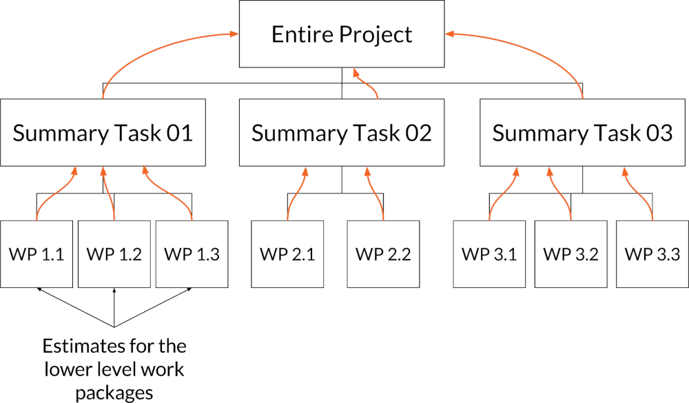 Bottom-Up EstimationAs you can see, it starts with the lower tasks and moves up to provide aggregate estimates for summary tasks and for the final level, the project itself. Ideally, bottom-up would always be used, but that is just not possible. If we are at the beginning of a project, we simply don’t have enough information to estimate every single work package precisely for the entire project. The best way to use bottom-up estimation is to combine it with phased estimation to produce a detailed analysis of each stage of the project. You can also combine it with parametric estimation and bring your predicted figures to an even higher degree of accuracy.