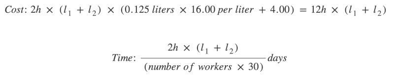 The surface of the saloon is then given by2h(l1+l2), where l1 is the length of the shorter wall and l2is the length of the longer wall. We can then come up with two parametric equations to estimate the cost and the time necessary to accomplish the project. Notice that our parameters are (1) the height h, (2) the lengths of the walls l1 and l2, and (3) the number of workers in the project.