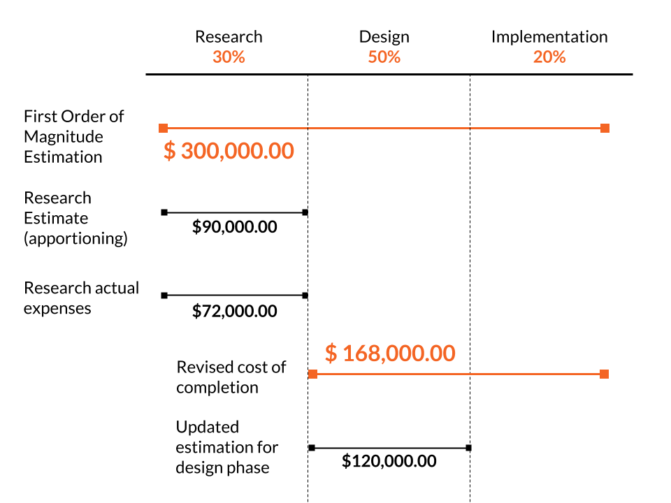 Bringing Together Phased Estimation and ApportioningLet’s understand how we can use the information from previous phases while creating the Order of Magnitude estimation for the next stages of the project. First, note that our initial guess was $300,000.00 to complete the project. As Research is supposed to consume 30% of the budget, the initial estimation for Research was $90,000.00. Once the Research phase is completed, we should proceed to updating our numbers. We do that by incorporating historical data into our model: the actual cost of the Research phase of the project. This cost was only $72,000.00, less than our initial estimate. Since this cost is supposed to account for 30% of the entire budget, we can update our estimations of the costs of the project as follows: