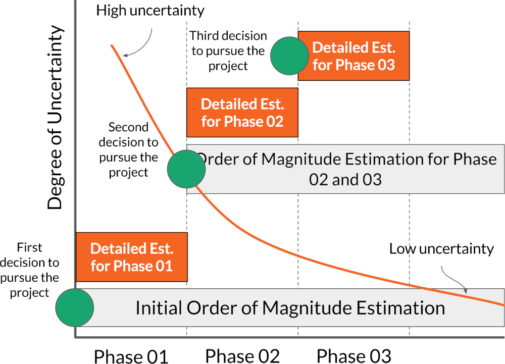 Phased Estimation DiagramIn practice, we should always have two estimates: a detailed estimation for the next phase of the project and the Order of Magnitude for the rest of the project. Another important aspect that the phasing estimations recognizes is the high uncertainty of a project in its initial stages. It deals with the uncertainty by breaking down the project into several phases, each of them considered a project itself.