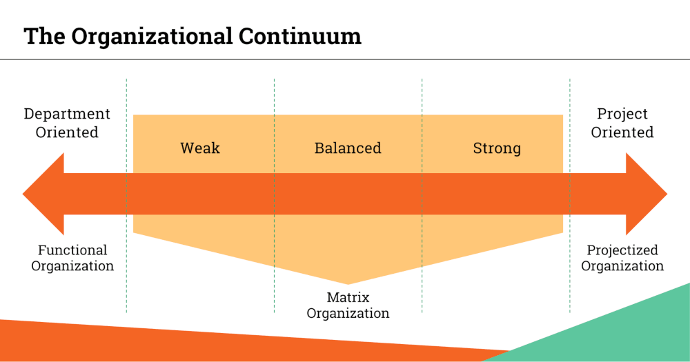Before talking about what lies in between the extremes of our continuum, let’s jump to the other side and visit what we call a “projectized organization”. Here, the project manager is king or queen. The team is dedicated, works on this one project, and the project manager acts as the manager of the team, possibly even writing performance appraisals. Basically everything goes around the project being implemented. The project is broken down into different areas, each one under the attention of a project member or a group of members.