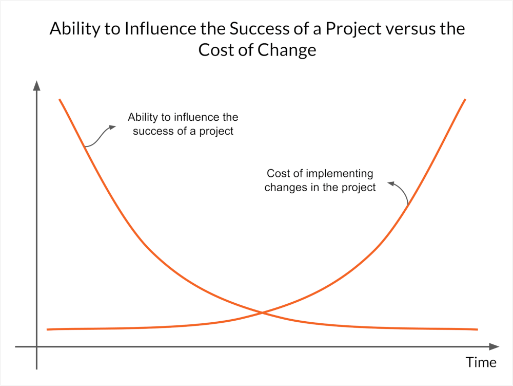 The basic reason why you should plan ahead is because a good planning is fundamental for the success of a project. It is much easier to influence the success of the project during the initial phases. On the other hand, the costs of change increase the further you carry the project. If you don’t plan properly and have to keep making change after change, rest assured that you will incur much higher costs than initially estimated. Have a look at this simple graph which illustrates the relationship between ability to influence the outcomes, the cost of change and the time horizon of a project.