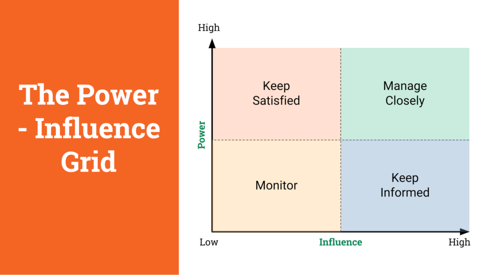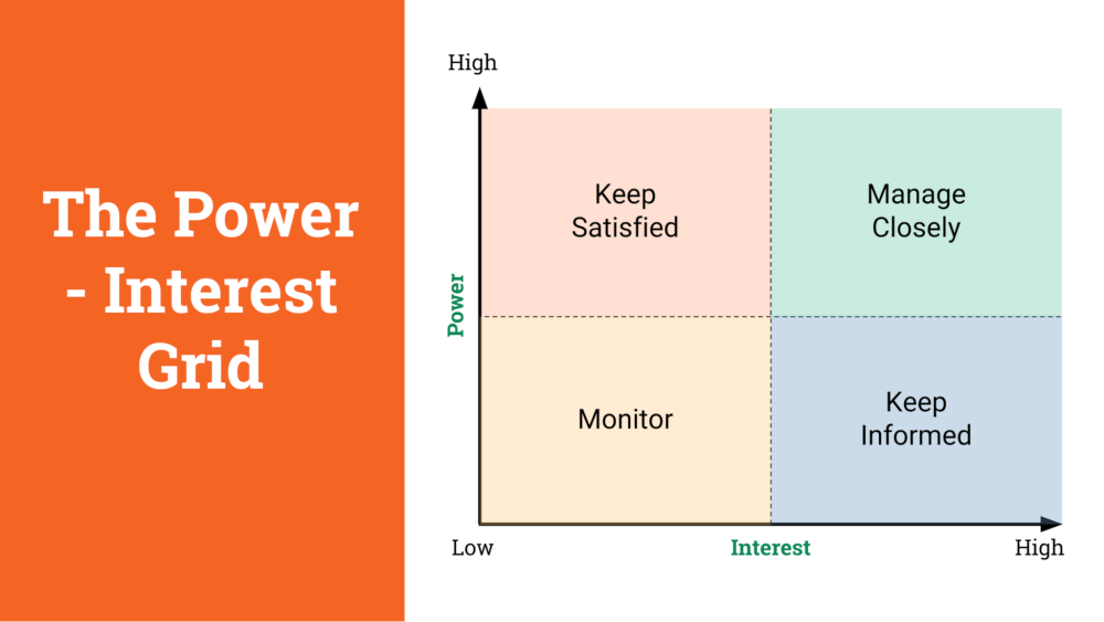 The Power-Interest GridThis tool helps you to consider how much power and influence each stakeholder has on the project. Simply position them in each of the four following quadrants: