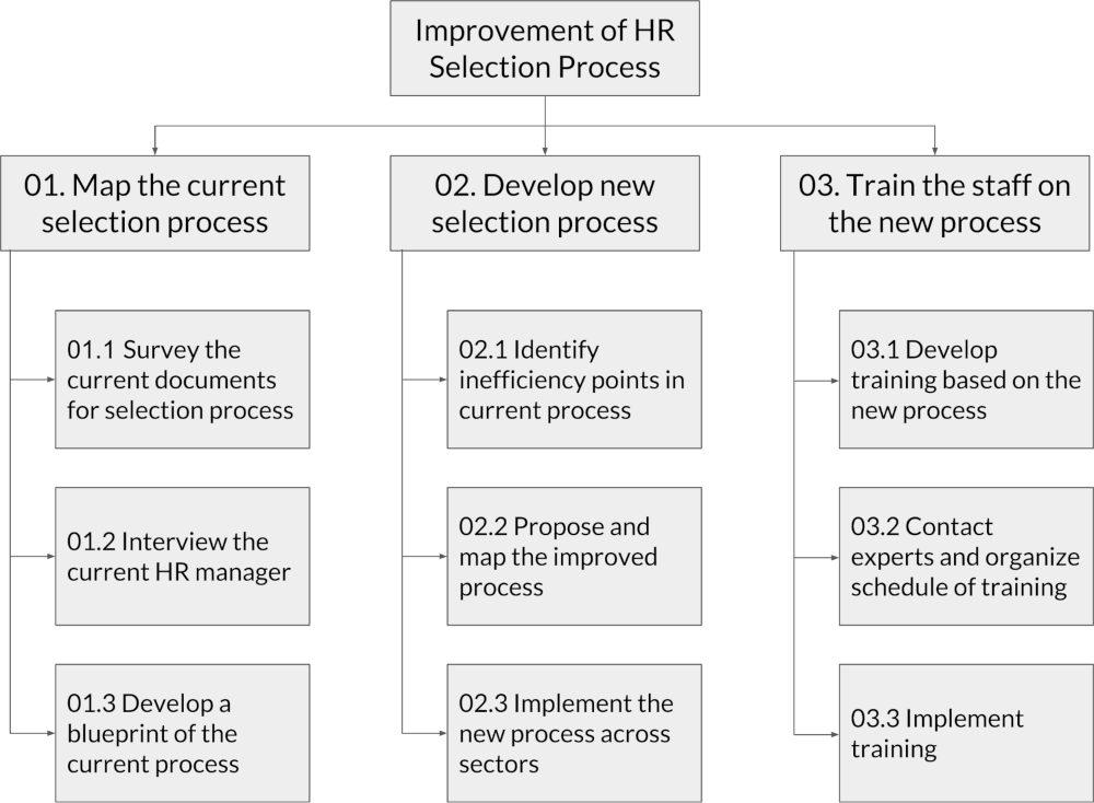 There are two types of work elements in the examples: summary tasks and work packages. A summary task involves several subordinate tasks, each one called a work package. In our example, a summary task can be outlines as “Map the current selection process”, and this task can be further broken down into several work packages like “Survey the current documents for selection process”, “Interview the current HR manager”, “Develop a blueprint of the current process”, etc. As you can see, work packages are practical tasks that can be objectively marked as completed. The summary task is marked as complete when all the work packages involved in it are successfully executed.